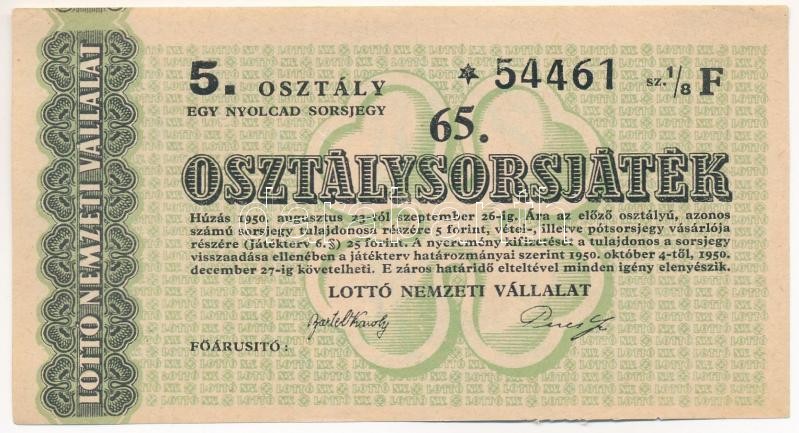 1950. "65. Osztálysorsjáték" 5. osztály 1/8 sorsjegy, "F" sorozat, felülbélyegzéssel T:I-,II