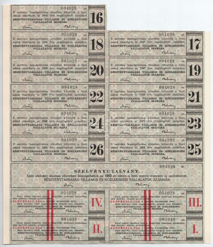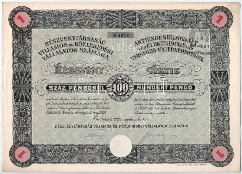 Budapest 1929. "Részvénytársaság Villamos és Közlekedési Vállalat... https://www.darabanth.com/en/409-Online-auction/409.0/Numismatics/Shares-and-Tickets~2500005/Budapest-1929-Reszvenytarsasag-Villamos-es-Kozlekedesi-Vallalatok-Szamara-tiz-reszve~II2525333