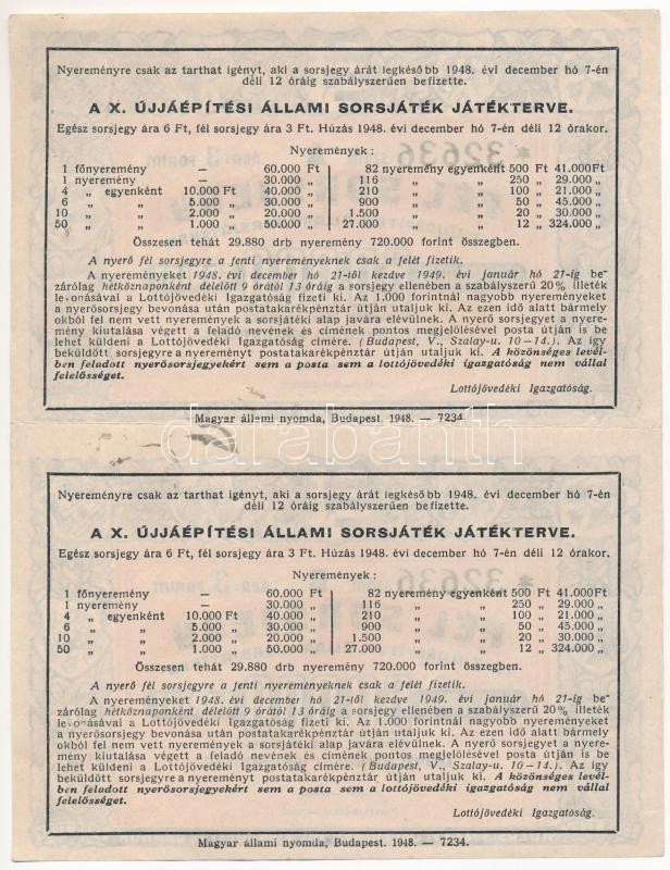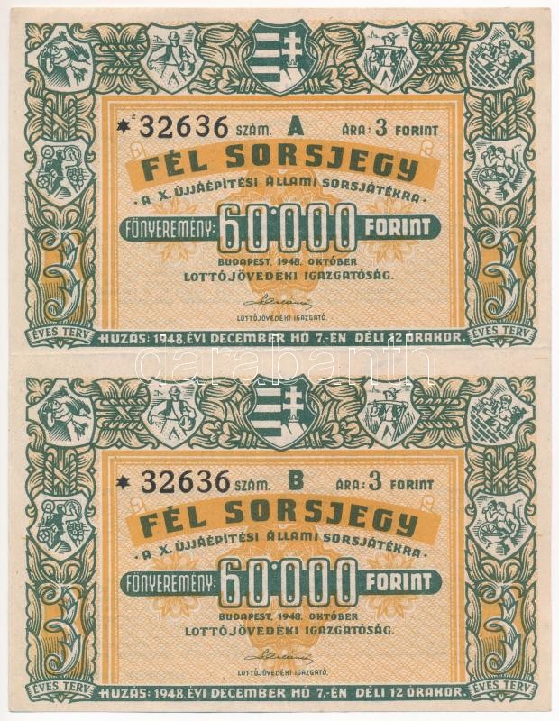 Budapest 1948. "Fél Sorsjegy - A X. Újjáépítési Állami Sorsjáték" sorsjegyek (2x) "A" és "B" sorozat, vízjeles papíron, összefüggésben T:II