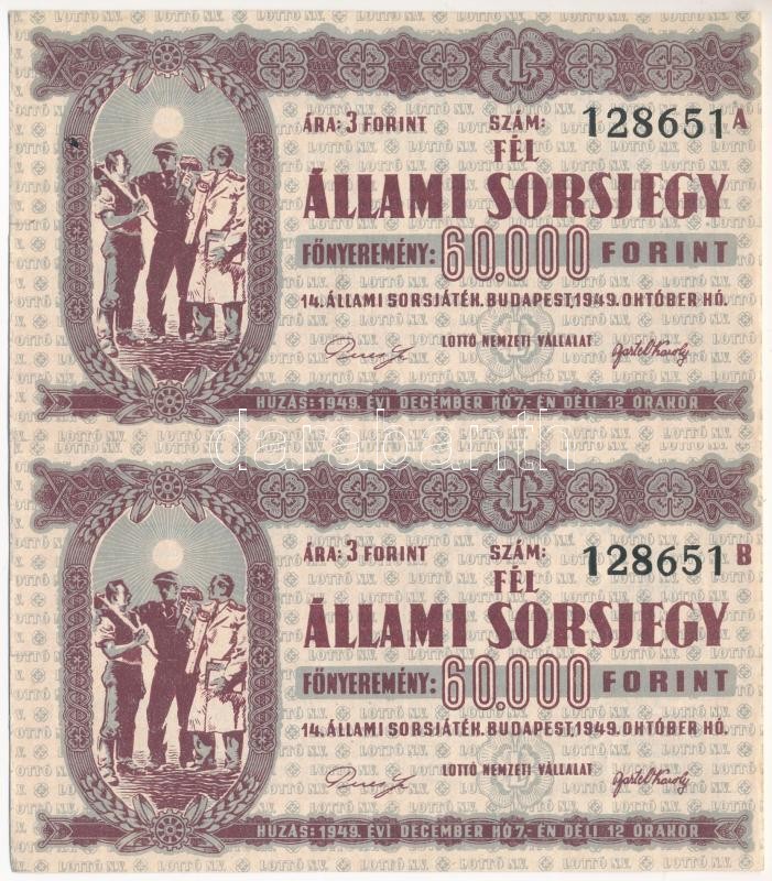 Budapest 1949. "Fél sorsjegy - 14. Állami sorsjáték" sorsjegyek (2x) "A" és "B" sorozat, vízjeles papíron, összefüggésben T:II-
