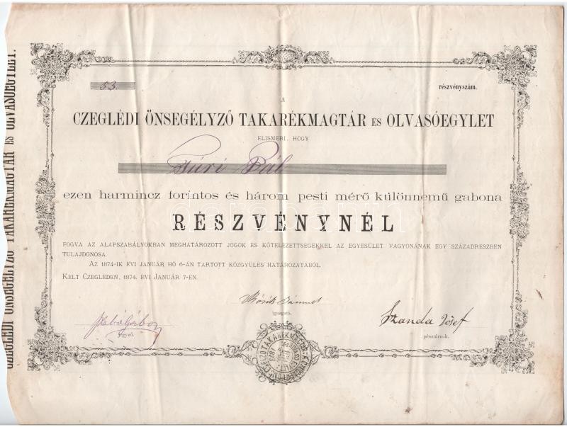 Cegléd 1874. "Czeglédi Önsegélyező Takarékmagtár és Olvasóegylet" névre szóló részvénye 30Ft és három pesti mérő különnemű gabona T:III