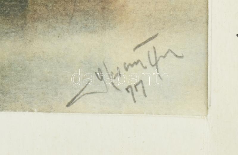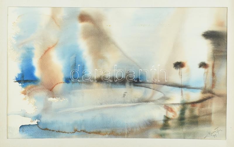 Hercsuth Ferenc (1942-): Vízparti táj, 1977. Akvarell, papír, jelzett. Paszpartuban. 24,5×41 cm. Soós Imre (1921-2013), műgyűjtő, művészeti író, a Kisgrafika folyóirat szerkesztője, a Magyar Nemzeti Galéria Baráti Köre alelnökének hagyatékából. 24,5×41 cm