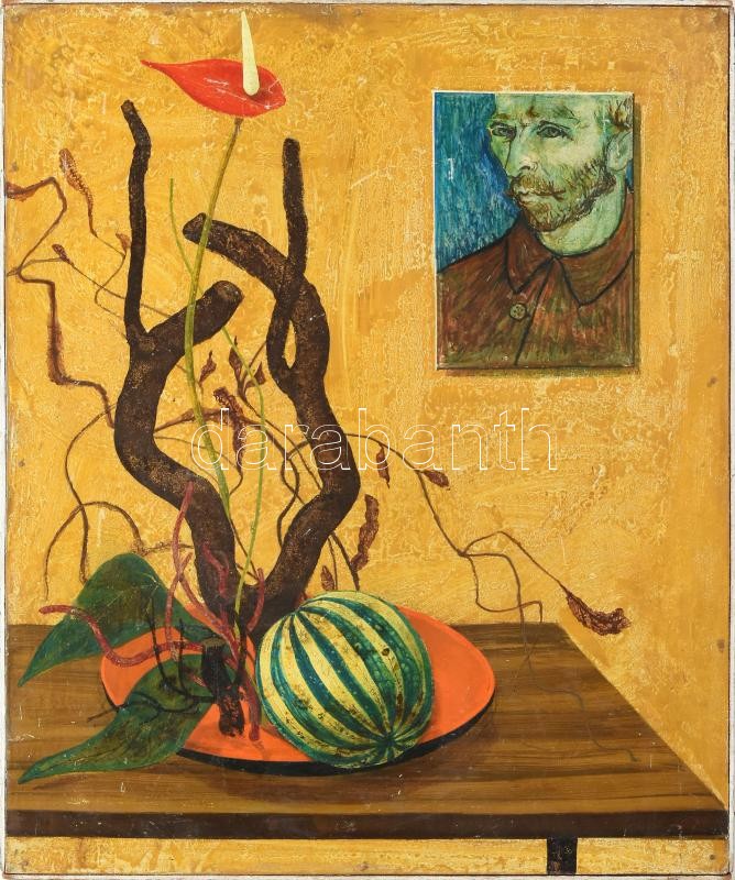Lázár Sándor (1916-1994): Csendélet van Gogh portréval. Olaj, farost, ... https://www.darabanth.com/en/409-Online-auction/409.0/Paintings-and-graphics/Paintings-and-graphics~500001/Lazar-Sandor-1916-1994-Csendelet-van-Gogh-portreval-Olaj-farost-jelzes-nelkul-hatold~II2533139