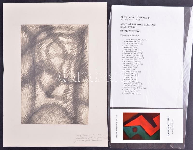 Magyarász Imre (1905-1972): Absztrakt kompozíció, 1968. Ceruza, papír, jelzett, paszpartuban, paszpartun Magyarász Imre autográf ajándékozási soraival Soós Imre részére. 28,5x19 cm. Soós Imre (1921-2013) műgyűjtő, művészeti író, a Kisgrafika folyóirat szerkesztője, a Magyar Nemzeti Galéria Baráti Köre alelnökének hagyatékából. + Magyarász Imre (1905-1972) festőművész kiállítása, Óbudai Társaskör Galéria, 2005, illusztrált kiállítási prospektus és műtárgyjegyzék.