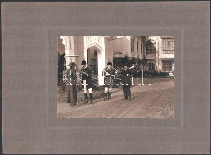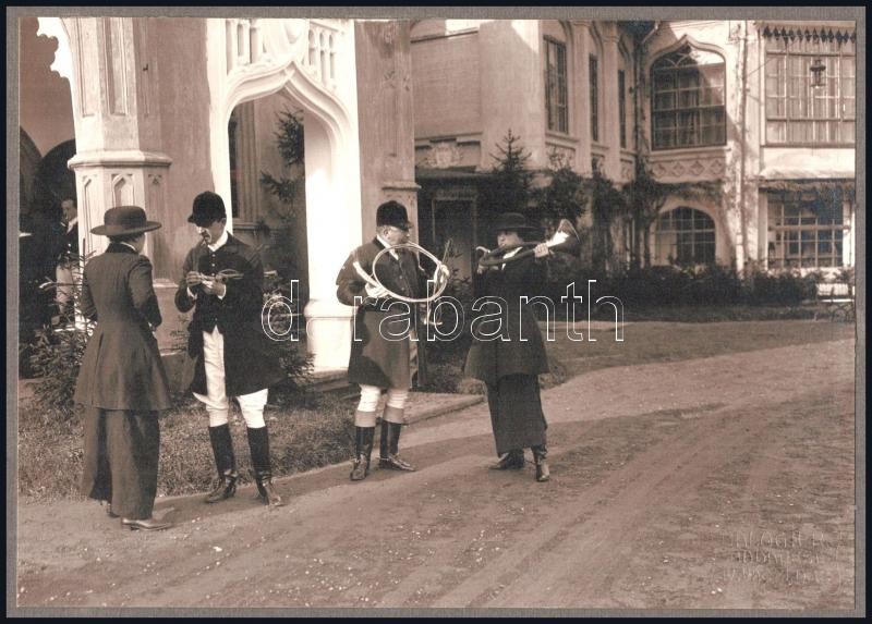 Description: cca 1930 Főúri készülődés falkavadászathoz, Balogh Rudolf (1897-1944) fotóművész szárazpecséttel jelzett, kartonra ragasztott fotója, szép állapotban, 12×17 cm