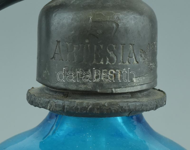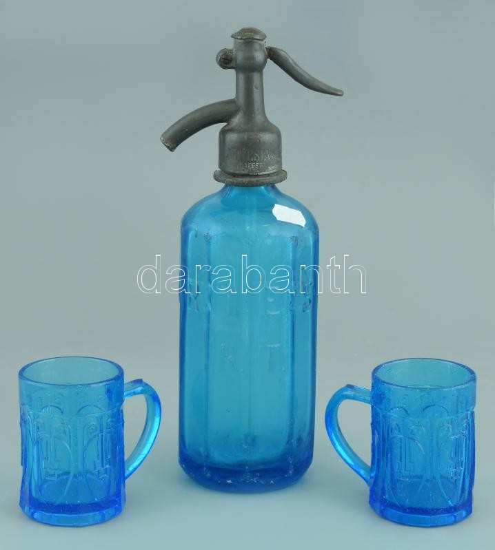 Artésia Budapest jelzett, kék szódásüveg 2db füles kék pohárral, kopot...