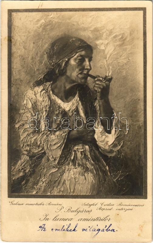 Description: In lumea amintirilor. Galeria maestilor Romani. Fotoglob Cartea Romaneasca / Romanian folklore art postcard, old Gypsy woman smoking a pipe s: P. Bulgaras (fl)
