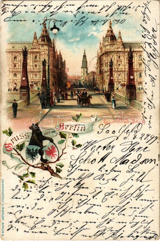 1899 Berlin, Kaiser-Wilhelm-Brücke / bridge. Kunstanstalt J. Miesler. Art Nouveau, coat of arms, floral, litho (EK)