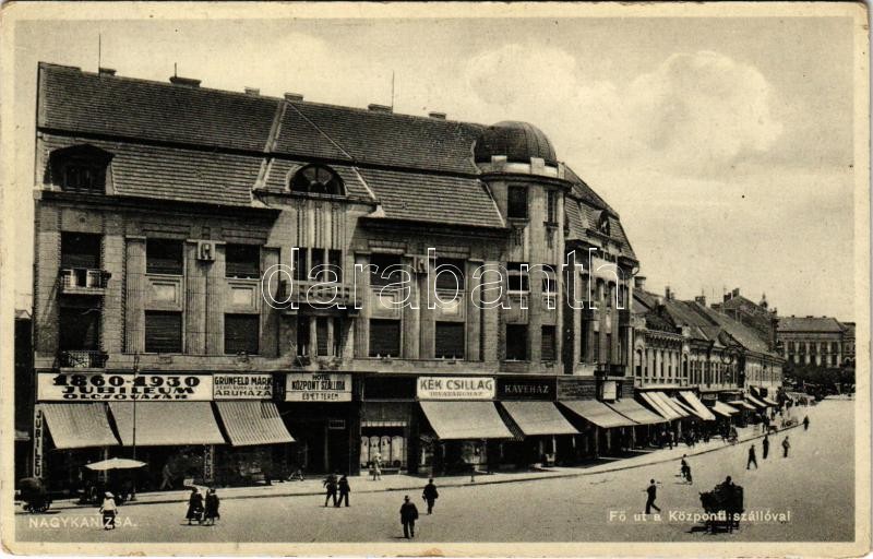 1932 Nagykanizsa, Fő út, Központi szálloda, étterem és kávéház, Grünfeld Márk üzlete, Kék Csillag divatáruház, 1860-1930 Jubileum Olcsóvásár (EK)