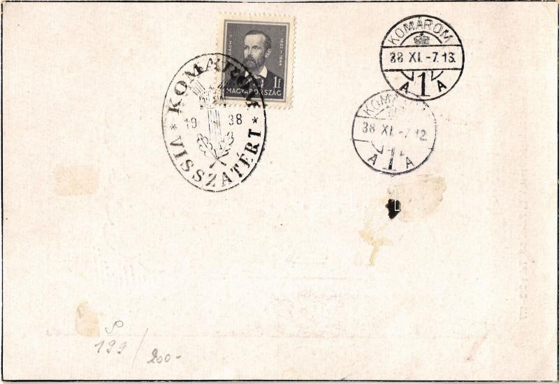 1938 Sopron, Propaganda Bélyegkiállítás Sopron 1938. IX. 11-20. s: Fery + "1938 Komárom visszatért" So. Stpl. (non PC) (EK)