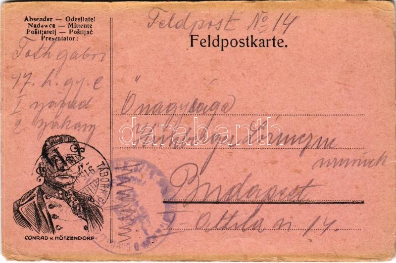 1915 Első világháborús tábori postai levelezőlap Conrad v. Hötzendorf ... https://www.darabanth.com/en/409-Online-auction/409.0/Postcards/Militaria~1000057/1915-Elso-vilaghaborus-tabori-postai-levelezolap-Conrad-v-Hotzendorf-vezerkari-fonok-arck~II2159270