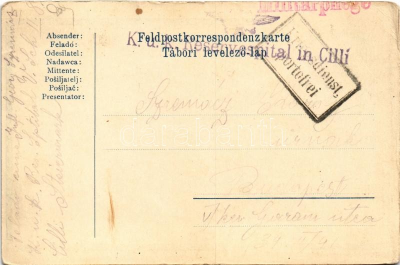 Description: 1916 Isonzo-Armee 1915 feliratú jelvény képe tábori postai levelezőlapon / WWI Austro-Hungarian K.u.K. badge on a military field post + "K.u.K. Reserevespital in Cilli" (kopott sarkak / worn corners)