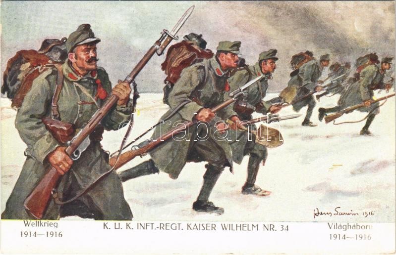 Description: Weltkrieg 1914-1916 - K.u.K. Inft.-Regt. Kaiser Wilhelm Nr. 34. Verlag K.u.K. Kmdo. der 27. Inf. Trp. Dion. / WWI Austro-Hungarian military art postcard, support fund, 34th Infantry Regiment s: Hans Larwin