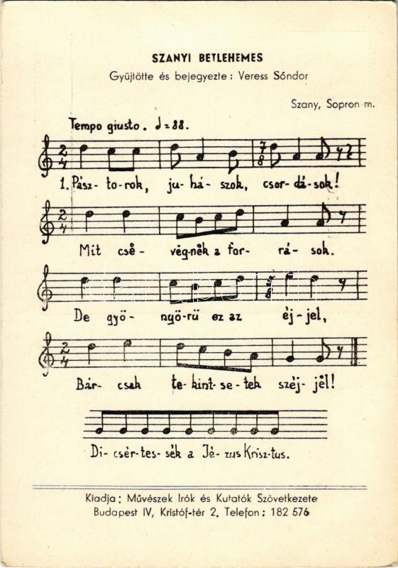 Szanyi Betlehemes. gyűjtötte és bejegyezte: Veress Sándor. Kiadja Művészek, Írók és Kutatók Szövetkezete. Kottás lap / Hungarian music sheet (EB)