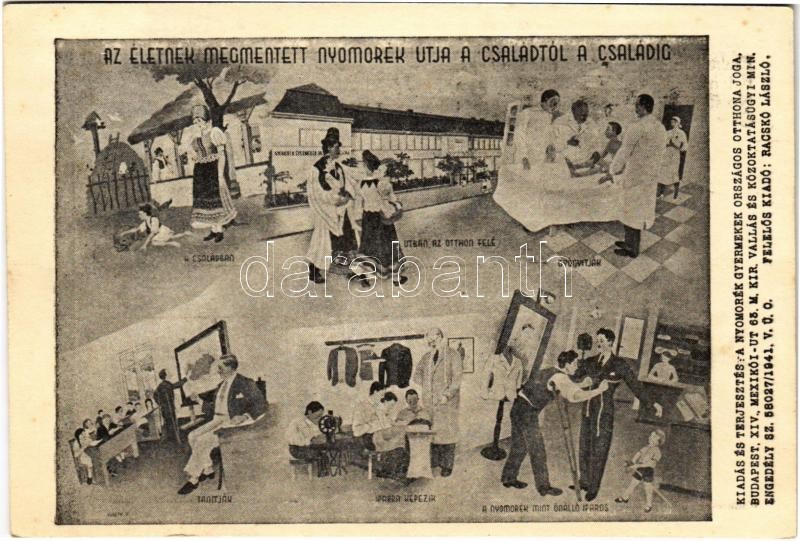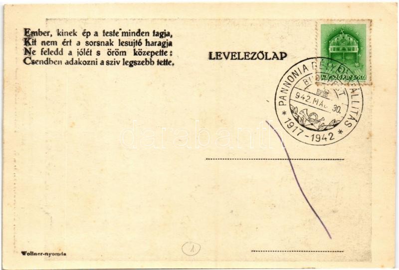 Az életnek megmentett nyomorék útja a családtól a családig. Kiadja a Nyomorék Gyermekek Országos Otthona / Hungarian charity fund for the disabled children + "1942 Pannonia BélyegkiállÃtás 1917-1942" So. Stpl. (EK)