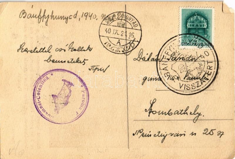 Description: Fundeni, Aceasta icoana a Sf. Imparati Constantin si Elena se vinde cu 5 lei pentru fondul restaurarii bisericii istorice din Fundenii-Doamnei, jud. Ilfov. Toate icoanele vor purta stampila Parohiei / icon of Holy Emperor Constantine and Empress Helena, church restore fund + "1940 Bánffyhunyad visszatért" So. Stpl. (EK)