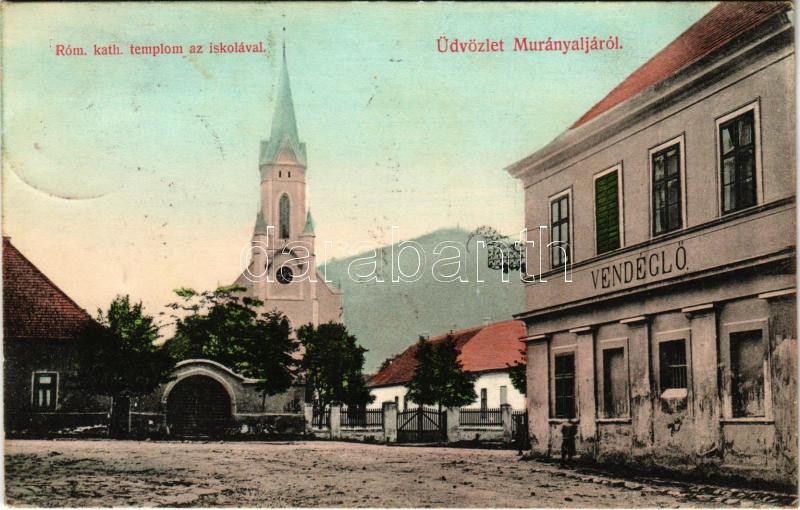 1909 Murány, Murányalja, Podmurán, Murán; Római katolikus templom és iskola, vendéglő / church and school, restaurant