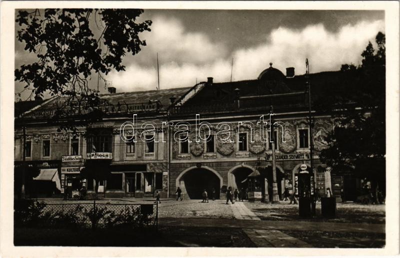 Description: 1948 Igló, Zipser Neudorf, Spisská Nová Ves; Dom Matice slovenskej / Matica ház, Alexander Schwartz, Balogh üzlete, Hitelbank / culture house, shops, bank