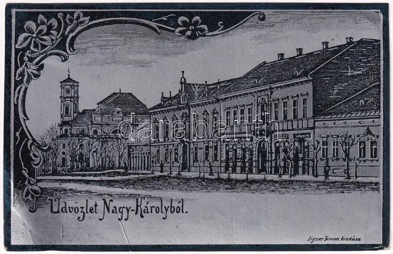 1900 Nagykároly, Carei; Szecessziós fémes hatású fóliás képeslap, Eigner Simon kiadása / Metallic foil postcard (EK)
