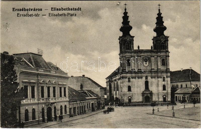 1916 Erzsébetváros, Dumbraveni; Erzsébet tér, templom, üzletek / Elisa...