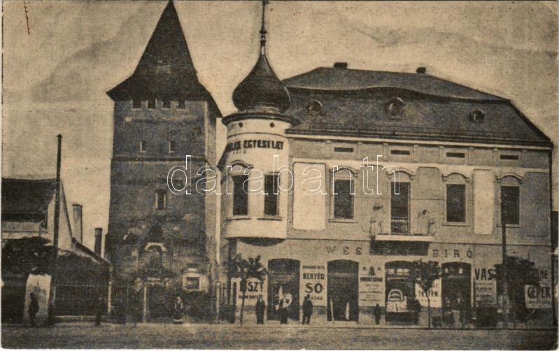 Description: Nagyszalonta, Salonta; Arany múzeummá átalakított Csonkatorony és az Arany Emlék Egyesület bérháza, Arany János szobor, Wessely és Biró üzlete / street view with János Arany Memorial Museum and shops (EK)
