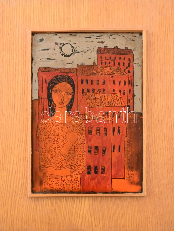 Lőrincz Vitus (1933): Modern lány. 1968. Tűzzománc. Jelzett. 29x20 cm....