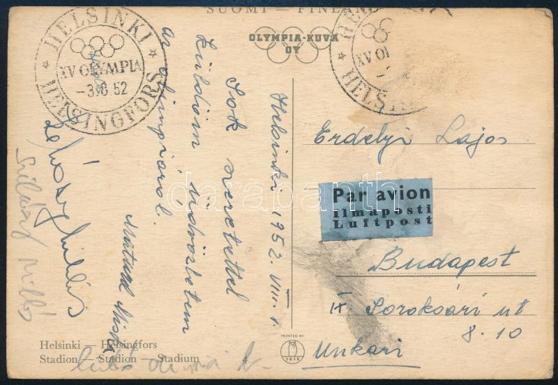 1952 Helsinki, Szilvásy Miklós (1925-1969) olimpiai bajnok birkózó és edzője, Matura Mihály (1900-1975) aláírása egy az olimpiáról küldött képeslapon.
