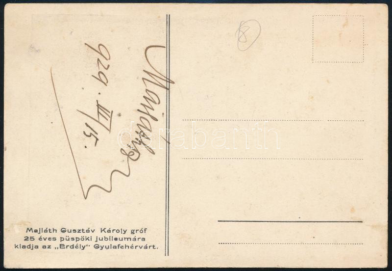 Gróf székhelyi Majláth Gusztáv Károly (1864-1940) erdélyi püspök aláírása levelezőlapon