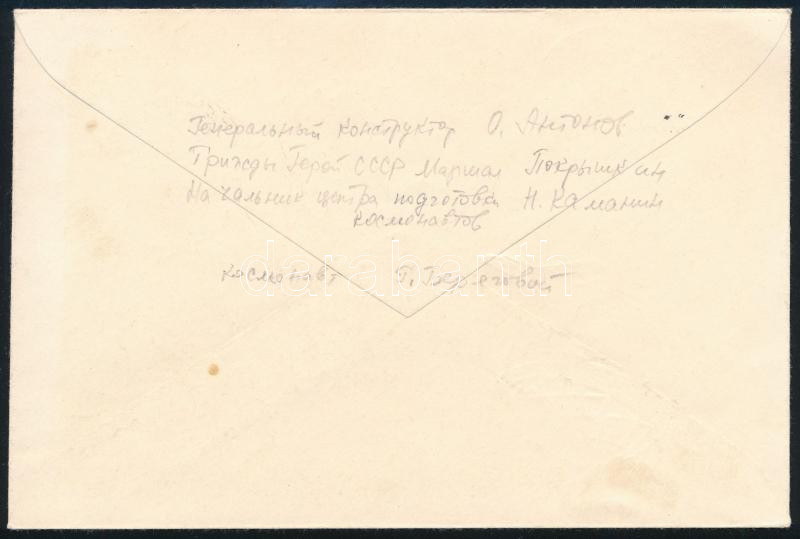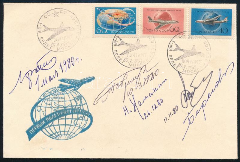 Oleg Konstantinovich Antonov (1906-1984) Soviet aircraft designer, Alexandr Ivanovich Pokrishkin (1913-19859 marshall of the Soviet airforce. Nikolai Petrovich Kamanin (1908-1982) Soviet pilot and Pavel Popovich (1930-2009) and Adriyan Nikolayev (1929-2004), Georgiy Beregovoy (1921-1995) autograph signature on cover