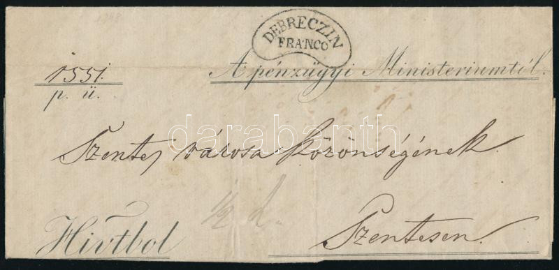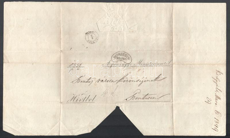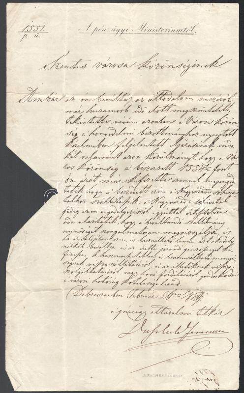 1849. február 26., Duschek Ferenc (1797-1873), az 1848/49-es forradalom és szabadságharc pénzügyminisztere (a Batthyány-kormány megalakulása után Kossuth, mint pénzügyminiszter államtitkári pozícióra hívta meg, azonban Kossuth egyéb elfoglaltságai miatt valójában már ekkor ő vezette a teljes tárcát; 1849. májusától a Szemere-kormányban már hivatalosan is pénzügyminiszter) autográf aláírása Szentes városának címzett, ón beváltásával kapcsolatos pénzügyminisztériumi levélen. "Pénzügy Ministerség" feliratú, címeres szárazbélyegzővel, "DEBRECZIN / FRANCO" bélyegzéssel.