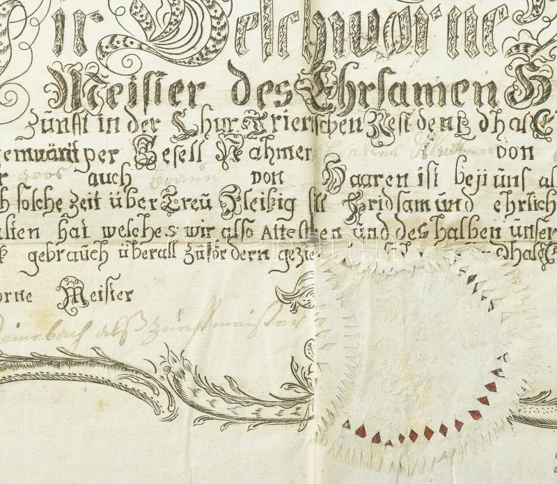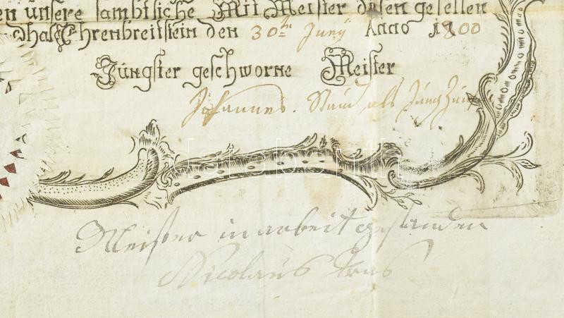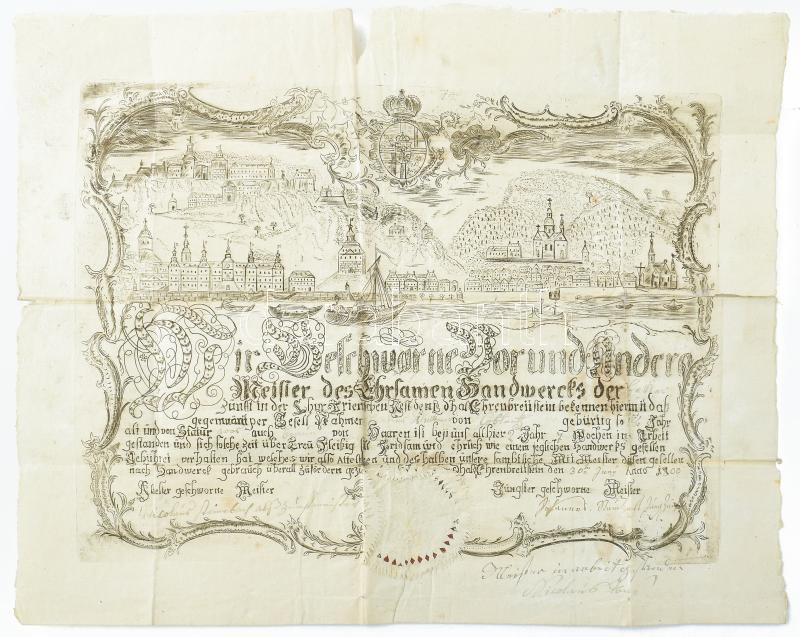 1800 Ehrenbreitstein (Koblenz mellett) város képével illusztrált nagyméretű rézmetszetű céhlevél, német nyelven, papírfelzetes viaszpecséttel, sérült, 34x42 cm.