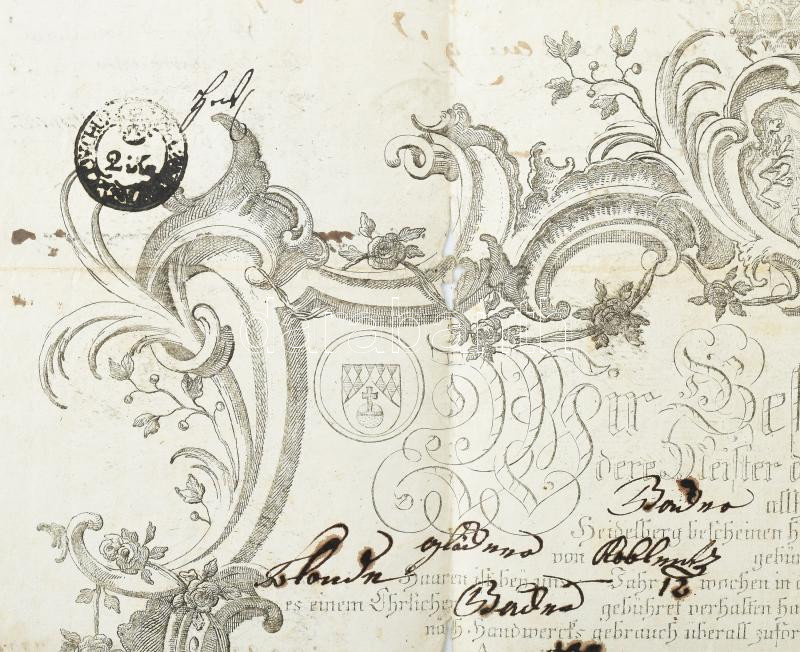 1800 Heidelberg város képével illusztrált nagyméretű céhlevél, német n...