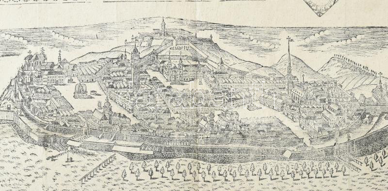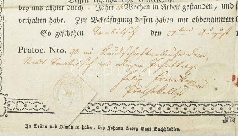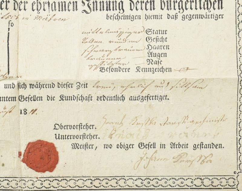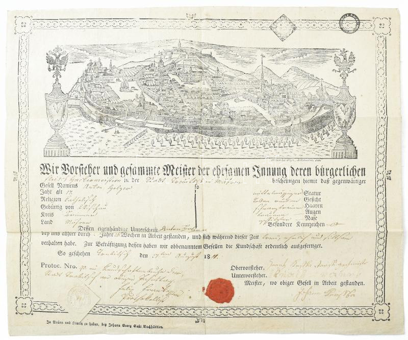 1811 Bruno (Brünn) morva város képével illusztrált, nagyméretű, Trebic-i (Trebitsch) mészáros részére kiállított német nyelvű céhlevél, jelzett a dúcon: Brünn bei Stph. Kohlneder, 1808., viaszpecséttel, és papírfelzetes viaszpecséttel, hajtott, 37x44 cm