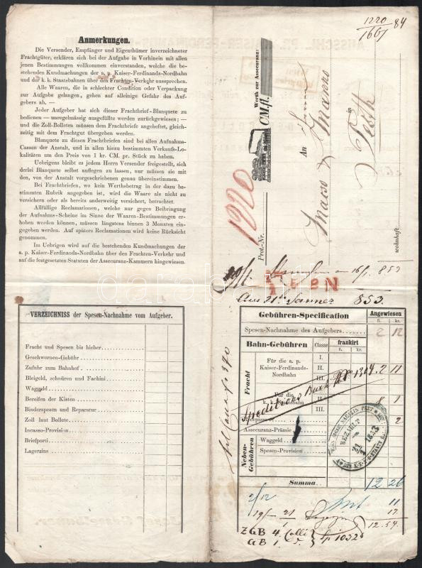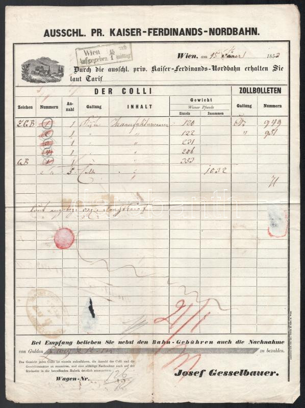 1853 Wien, Ausschl. Pr. Kaiser-Ferdinands-Nordbahn vasúti fuvarlevél