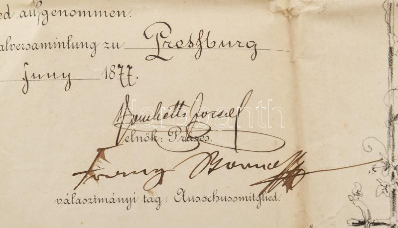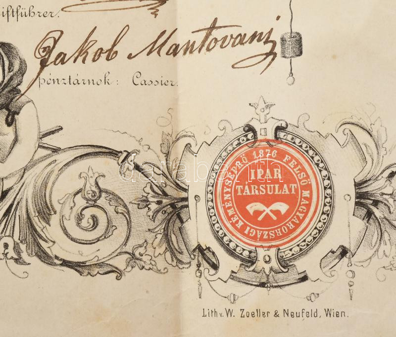 1877 Pozsony, a Felsőmagyarországi kéményseprő ipartársulat mesterlevele Hardtner Károly részére. Dekoratív, litografált oklevél. Lith. v. W. Zoeller & Neufeld, Wien. Hajtott, lapszéli sérülésekkel, foltos, 58,5x45,5 cm / Bratislava, Pressburg, chimney sweep master's certificate, lithography, folded, damaged edges, stained, 58.5x45.5 cm