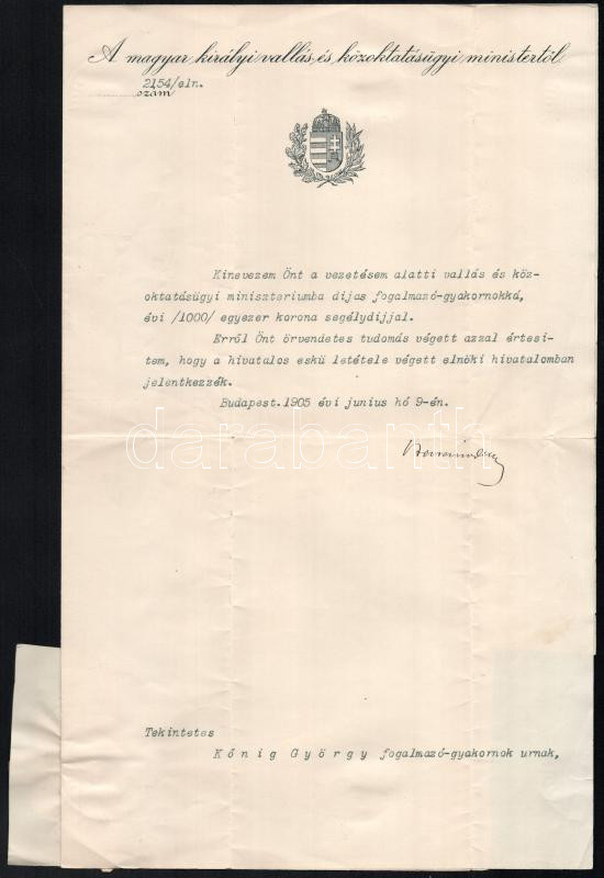 Description: 1905 Berzeviczy Albert (1853-1936) vallás és közoktatásügyi miniszter (1903-1905) aláírása egy gyakornoki kinevezésen, fejléces papíron, Bp., 1905. jún. 9.