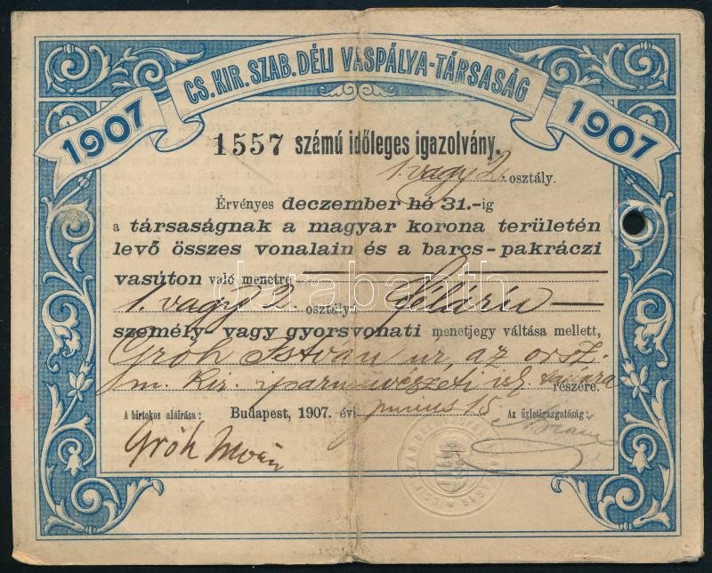 1907 Gróh István (1867-1936) iparművész, művészettörténész, az Országos Magyar Királyi Iparművészeti Iskola (ma: Moholy-Nagy Művészeti Egyetem) tanára, késÅ‘bbi rektora (1927-1925) fényképes félárú vasúti igazolványa, Cs. Kir. Szab. Déli Vaspálya-Társaság, rajta Gróh István sajátkezű aláÃrásával.
