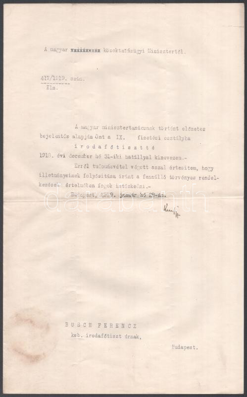 1919 Kunfi Zsigmond (1879-1929) közoktatásügyi miniszter (Berinkey-kormány, 1919. január 22. - március 21.) aláírása kinevezésen, foltos.