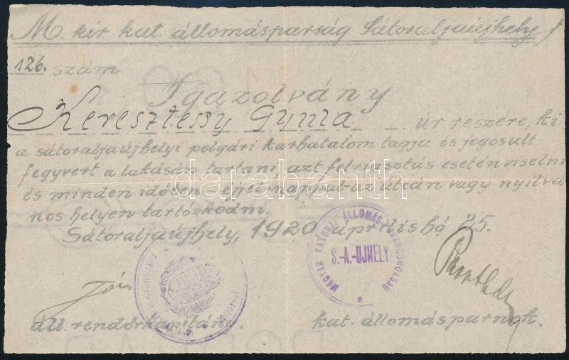 Description: 1920 Sátoraljaújhely, M. Kir. Kat(onai) Állomásparancsnokság fegyverviselési igazolványa polgári karhatalom tagja részére, Sátoralajújhely, 1920. április. 25., pecséttel.