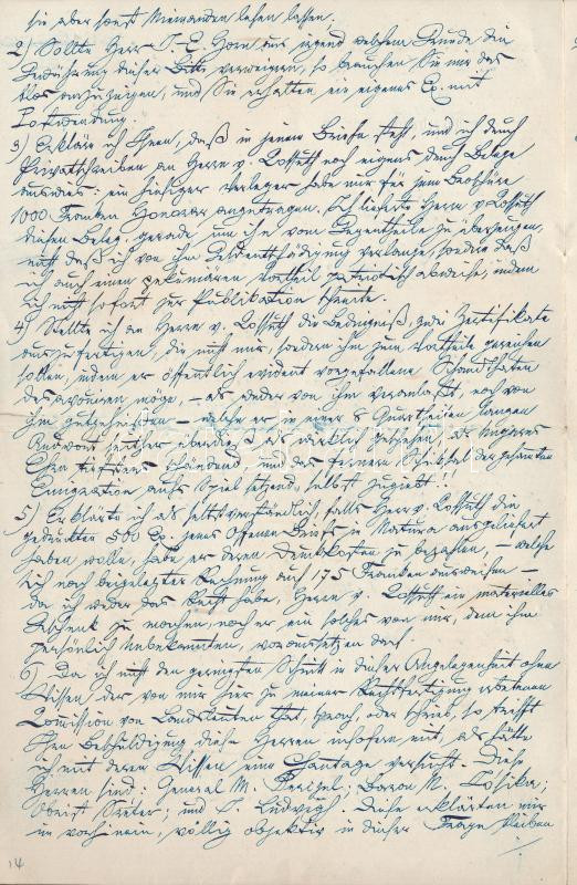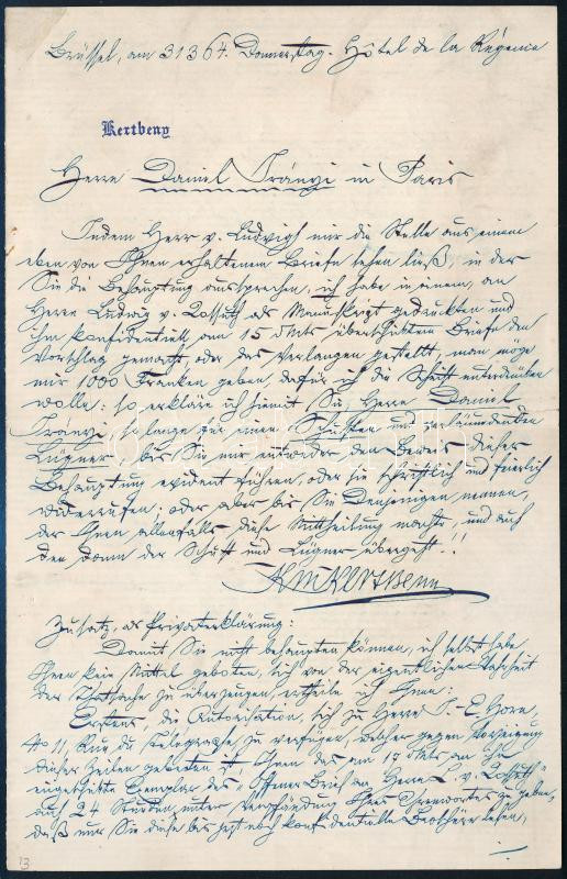 1864.III.31, Brüsszel, Kertbeny Károly (1824-1882) újságÃró, műfordÃtó, könyvész, bibliográfus autográf kézzel Ãrt levele Irányi Dánielhez (1822-1892), a márciusi ifjak egyikéhez Párizsba. Kertbeny többször emlÃti Kossuth Lajos (1802-1894) nevét, többek közt egy Kossuthnak cÃmzett nyÃlt levelet is megnevez. Kertbeny Kossuthnak szóló nyÃlt levelében az Itáliában élÅ‘ egyes magyarok bűntetteirÅ‘l Ãrt 1864-ben (Offener Brief an Herrn Ludwig von Kossuth, früheren Gouverneur von Ungarn, derzeit in Turin, betreffend die Verbrechen einiger Ungarn in Italien. Abgesendet von ... Brüssel, 1864.). Három beÃrt oldal német nyelven, Kertbeny Károly autográf aláÃrásával, fejléces papÃron.