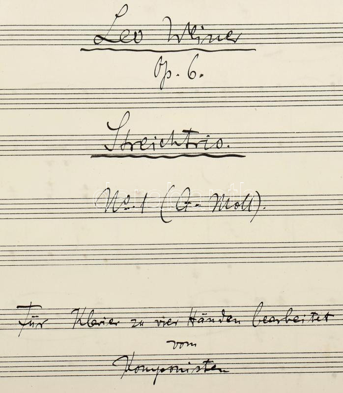 Leo Weiner Op. 6. Streichtrio No. 1. (G-Moll). I-IV. Für Klavier zu vier Händen bearbeitet vom Komponsten. Modern egészvászon-kötés, jó állapotban, 30 sztl. lev.