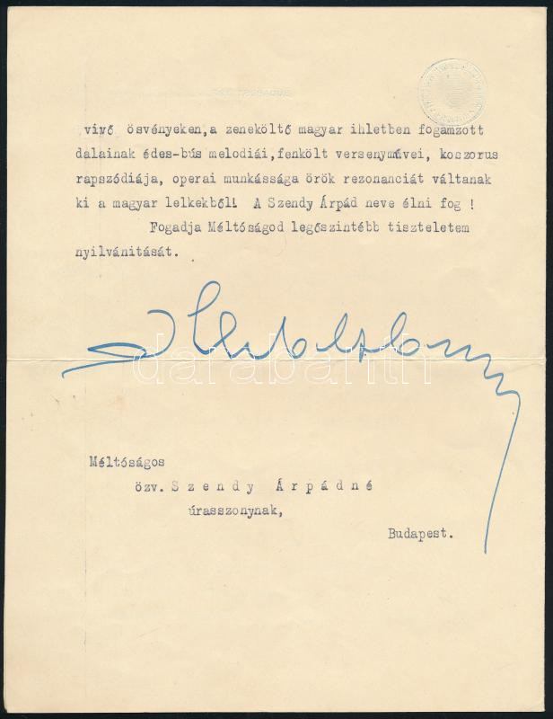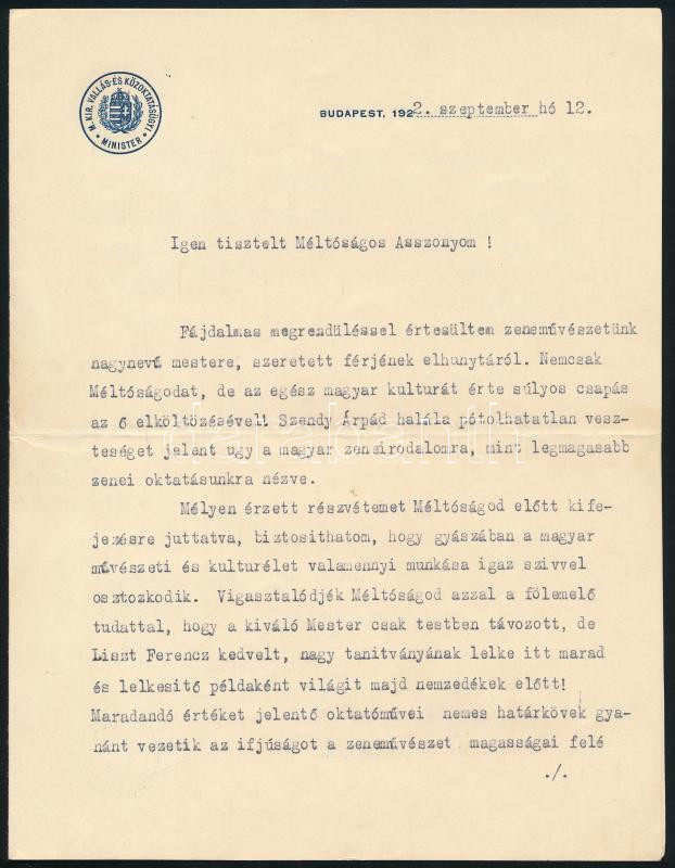Description: 1922 Klebelsberg Kunó (1875-1932) vallás- és közoktatásügyi miniszter (1922-1931) gépelt kondoleáló levele, autográf aláírásával, Szendy Árpád (1863-1922) zongoraművész és - tanár, zeneszerző özvegye részére, miniszteri fejléces papíron, borítékkal, 1,5 gépelt oldal