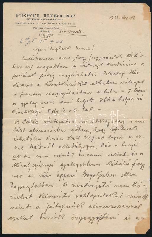 1934 Maróczy Géza legendás sakkozó saját kezű levele
