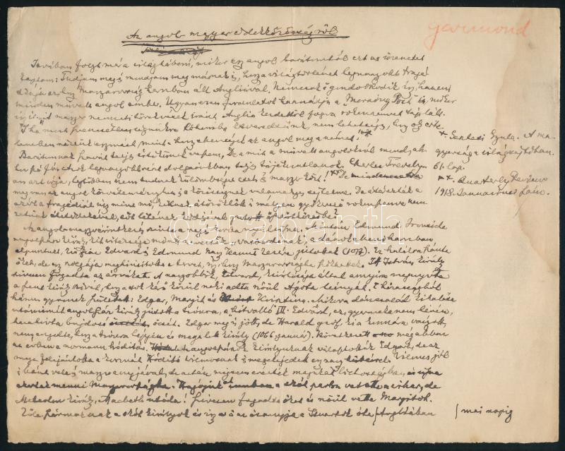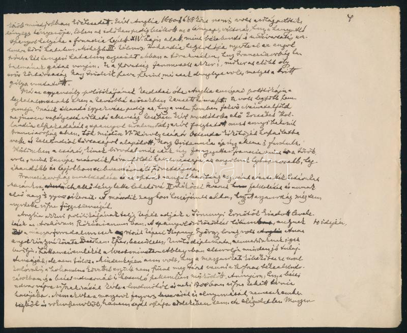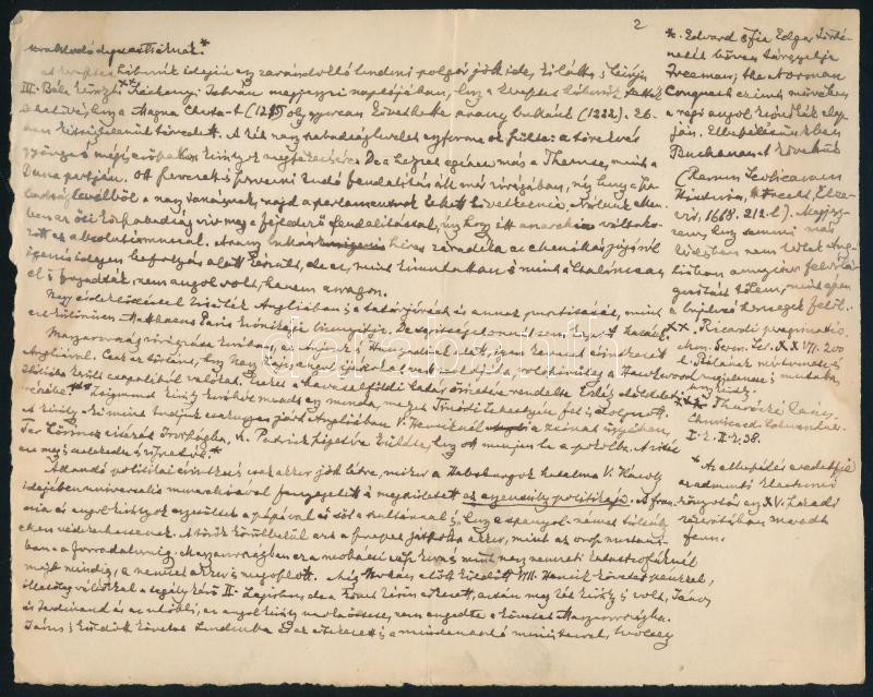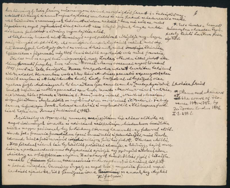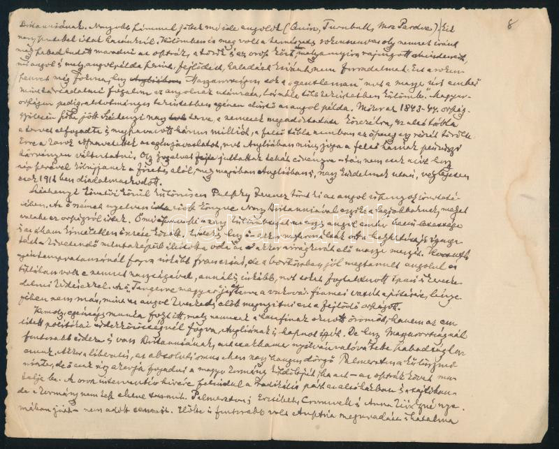 Description: cca 1919 Marczali Henrik (1856-1940) történész "Az angol magyar érdekközösségről" c. tanulmányának kézirata, feltehetőleg nem teljes 1-2 lap hiánnyal, foltos, 8 p. Publikálva: 1919 Századok LIII. évf. 3-10. sz.1919. márc.-dec.: Marczali Henrik: Angol-magyar érdekközösségről a múltban, 113-123 p.
