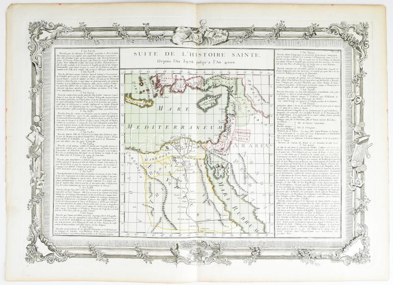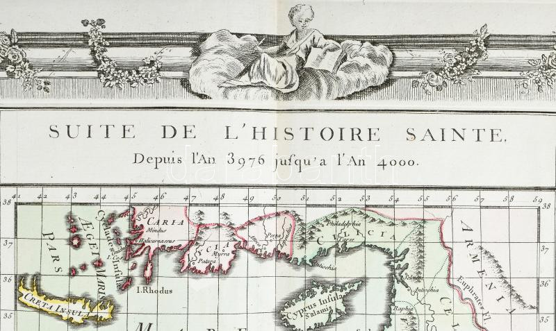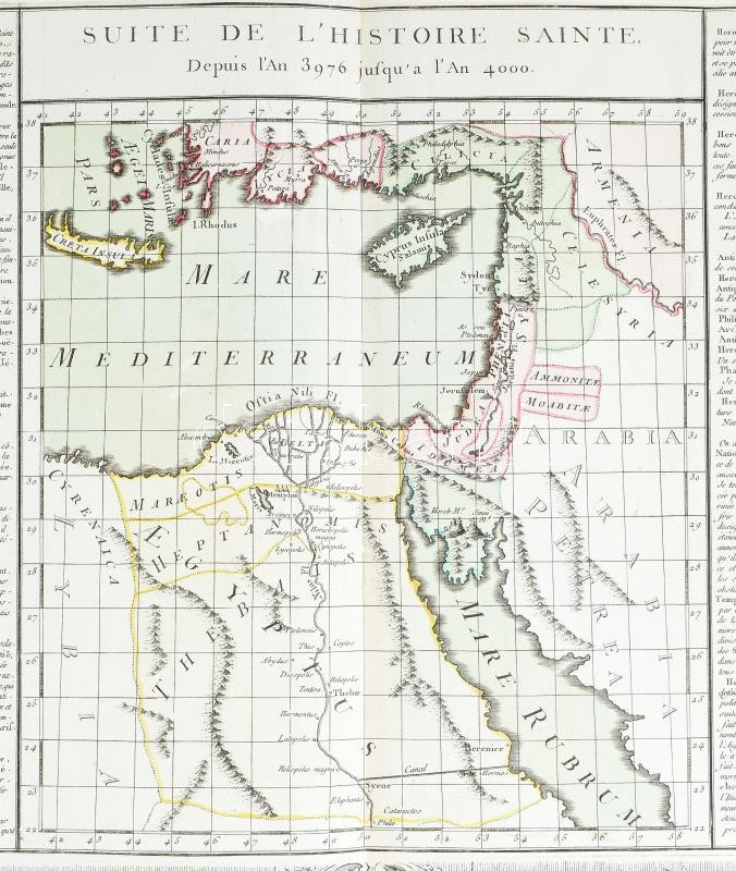 Brion de la Tour, Louise (1743-1830): Suite De L'Histoire-Sainte Depuis L'An 3976 Jusqu'? l'An 4000 - A Szentföld és Ciprus térképe. Megjelent: Atlas général et élémentaire pour l'Etude de la géographie et de l'histoire moderne di Louis Brion de la Tour, 1766.. Színezett rézmetszet 535x380 mm / Colored map of the Holy Land and Cyprus.