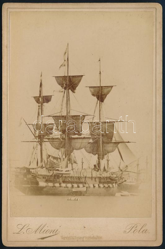 cca 1860 Az S.M.S. Bellona 44-es fregatt (ca 1840-1903) hajóról készült kabinetfotó. A hajóról kapta a nevét Polában a Bellona móló az Oliva sziget mellett. / S.M.S. Bellona