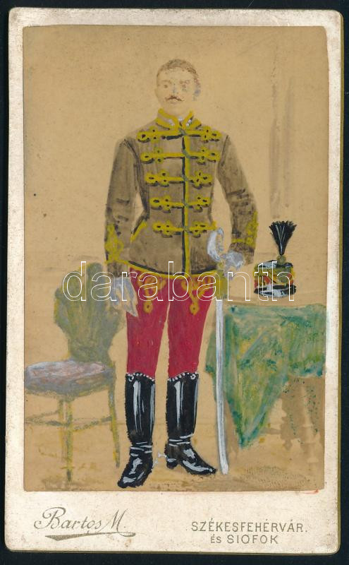 cca 1880 Magyar huszár egyenruhában, keményhátú fotó Bartos (Székesfehérvár, Siófok) műterméből, korabeli kézi festéssel, jó állapotban, 10,5×6,5 cm