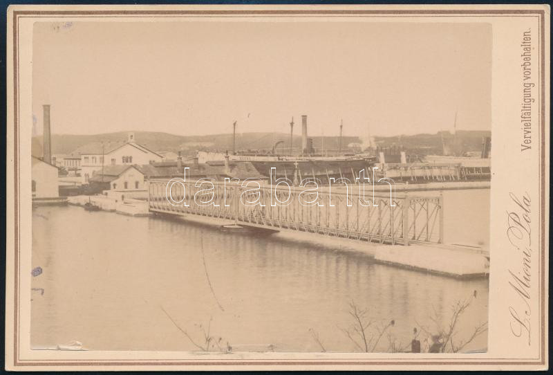 Description: cca 1886 Pola vashíd az Oliva sziget és a szárazföld között. Nagyobb méretű keményhátú fotó 17x11 cm / Pola. View of the iron girders bridge connecting Olive Island to the mainland. by the studio of L. Mioni, Pola 17x11 cm