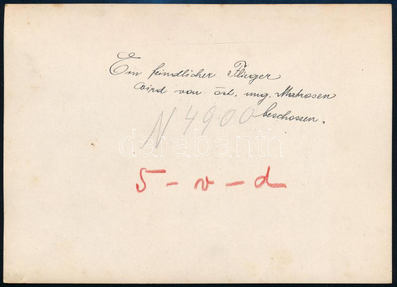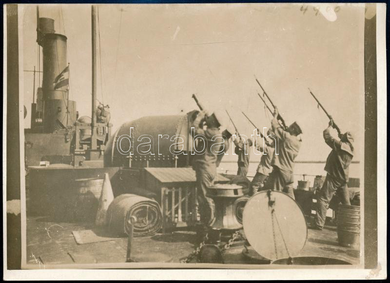cca 1914-1918 A legénység ellenséges repülőgépre tüzel az Osztrák-Magyar Cs. és Kir. Dunaflottilla (K. u. k. Donauflottille) hadihajójának fedélzetén. Eredeti fotó, a hátoldalon feliratozva, egyik sarka kissé sérült, 17,5x12,5 cm / cca 1914-1918 Crewmen on board a battleship of the Austro-Hungarian Danube Flotilla (K. u. k. Donauflottille) are firing at an enemy airplane. Original photo, with description on the back, minor damage on one corner, 17.5x12.5