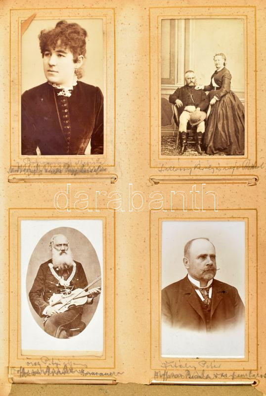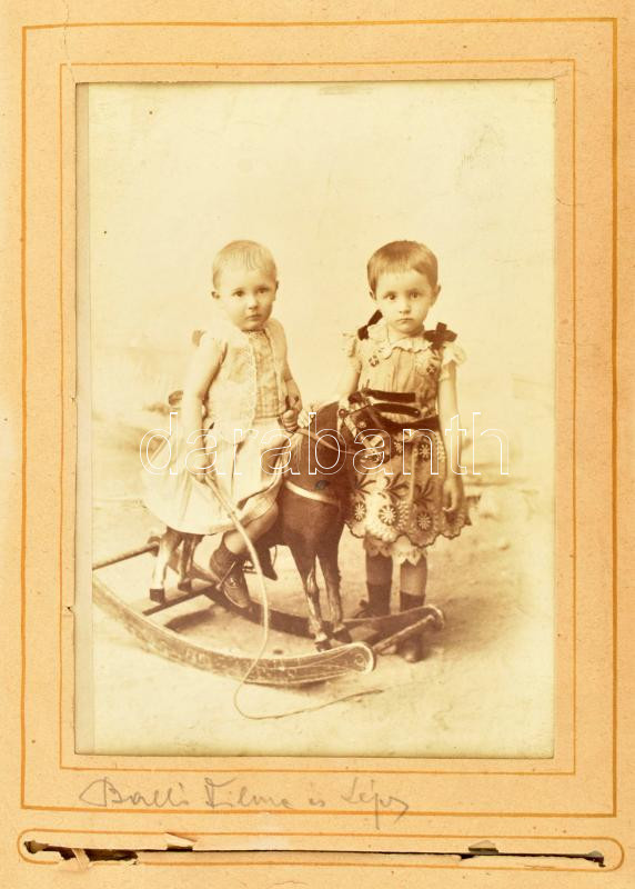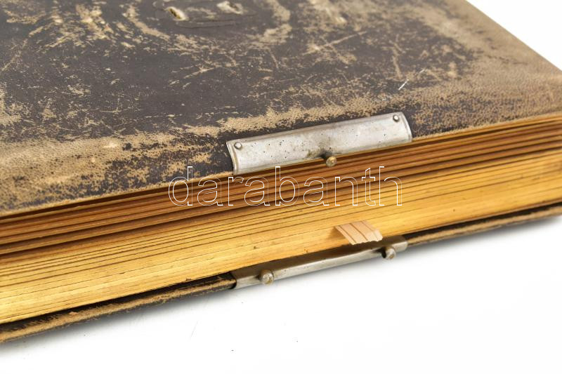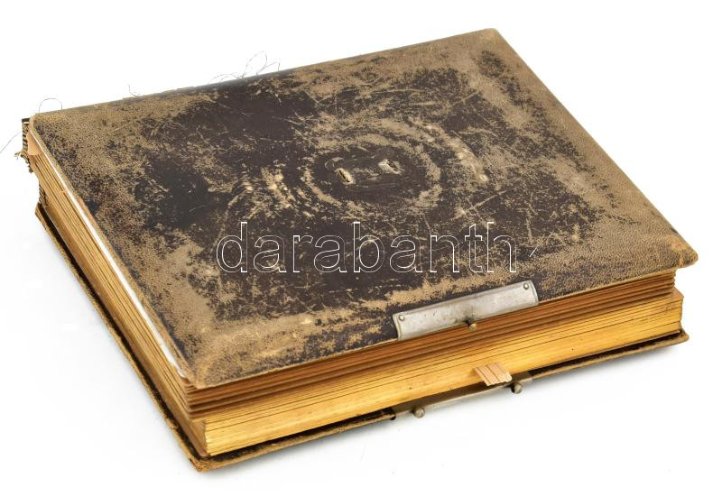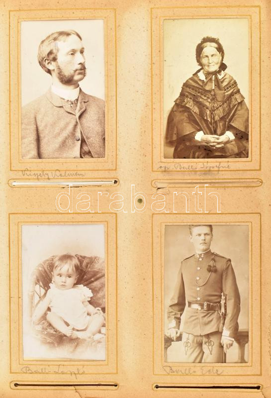 VÉDETT!! / PROTECTED NO EXPORT!! cca 1860-1940 Balló-Vitális-Bobrovniczky felvidéki család nevesített fotóalbuma, össz. kb. 109 fotó, többségében keményhátú; többek közt Balló Ede (1859-1936) festőművész (4 db); Siklósy Károly (1816-1894) orvosdoktor, Pest városának főorvosa; Balló Aurél (1871- 1940) festőművész, Balló Ede féltestvére; Vitális Péter (1845-1909), Ferenc József-rendi tiszt, köz- és váltóügyvéd, Liptó vármegye tiszti főügyésze (2 db fotó), valamint cigány zenész hegedűvel, több baba és kisgyerek portré, Vitálisfalva sírkert, Vágparti részlet, Liptószentmiklósi részletek, udvarok, enteriőrök festményekkel és műtárgyakkal; lovaglás, vadászat stb. Klf. műtermekből: Král Gusztáv (Liptószentmiklós), Divald Károly (Eperjes), Max Braunberg (Liptószentmiklós), Schwarz Adolf (Eperjes), Faden Mihály (Liptószentmiklós), Rosenblatt Emánuel (Eperjes), Javorik&Jandaurek (Unghvar-Ungvár, Schemnitz-Selmecbánya, Teschen), Alois Baker (Schemnitz-Selmecbánya), Szinay és Társa (Miskolc), Goszleth István (Bp.), S. Kraus (Biala), Bernhard Wagner (Carlsbad) stb.. Antik bőrkötésű, sérült, kettévált albumban, fedele lejár, egyes albumlapok részben sérültek.